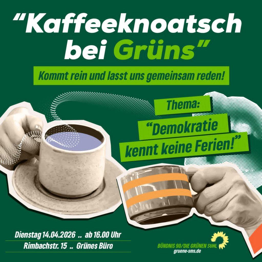 Die Grünen Suhl veranstalten am Dienstag, den 14. April 2026, um 16:00 Uhr im Grünen‑Büro, Rimbachstraße 15, Suhl, das monatliche Kaffeeknoatsch zum Thema Demokratie. Ziel ist ein niederschwelliger Austausch mit Bürgerinnen und Bürgern, unterstützt durch ein kurzes Quiz.